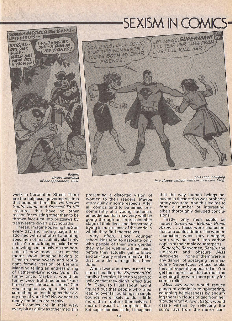 The problem arises when these foaming maniacs are presented in the media as being a representative cross section of the women’s movement, thus reinforcing the image of feminism that most men are only too eager to accept as the truth: an army of crop-haired Amazon gargoyles who chainsmoke untipped Woodbines, shift cement blocks for a living and have a physique somewhere between that of Popeye and a Commer van.