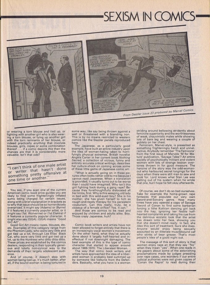 “Moore has long ago declared an interest in the image of women in comics books and recently confirmed that he has always felt ‘that [women’s problems] was an area that needed to be addressed’. 25 years ago, in a three-installment essay in The Daredevils he wrote of ‘Invisible Girls and Phantom Ladies’, i.e. sexism in comics. Although the text is written in a jocular tone, the main message is quite serious: that comics are rather fueling sexism and gender inequality than combating them. Women in mainstream comics are said to serve primarily as decoration, especially in visual terms, this being the case even when the female characters have something important to say. Such an approach to the visual presentation of females is a continuation of a long-standing tradition, visible as early as in comic strips from the first half of the twentieth century. Moore claims, however, that graphic depiction is not as important as the type of character as which the woman is presented. Both ‘helpless quivering victims’ and pale copies of female superheroes, as well as examples of rough ‘Marvel-style’ feminism serve to fuel stereotypes. In the case of the first two, scantily-clad and often captured and tied up heroines are accused of fueling ‘sordid adult fantasies’ and ideas such as women enjoying being raped. In the final installment of the essay Moore opines that the masculine world of comics is unlikely to significantly change its approach in favor of equal rights unless it is motivated from the outside – by the readers.”