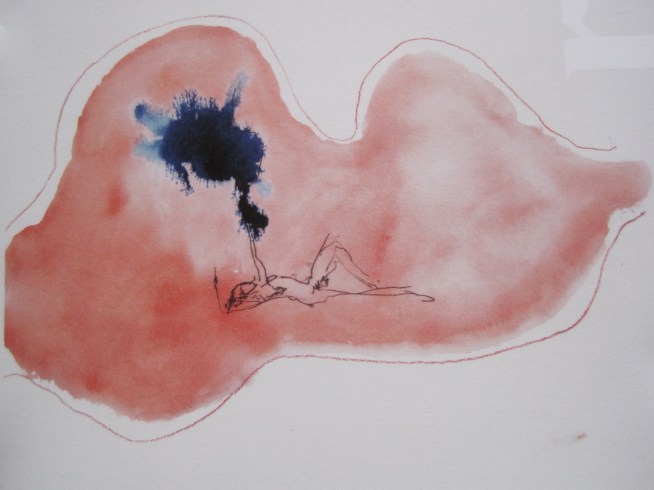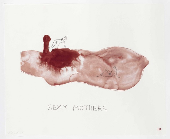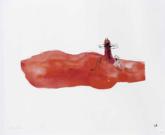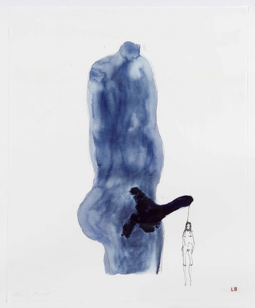 Bourgeois began the project by painting male and female torsos on paper; the gouache pigments are combined with water to give fluidity to the mixtures of red, blue and black. All the bodies are depicted in profile, in various positions, presenting delicate silhouettes that form the basis of the final works. These were then passed to Emin for embellishment, who reportedly cradled them like porcelain babies for months on end, until she finally saw beneath the surfaces of the mute bodies. Emin’s contribution consists of smaller figures drawn in pencil and the addition of occasionally coherent, hurriedly scratched out words. The idea is that Emin’s additions tease out the emotions, anxieties, ideas and histories that already lay dormant in Bourgeois’ paintings.