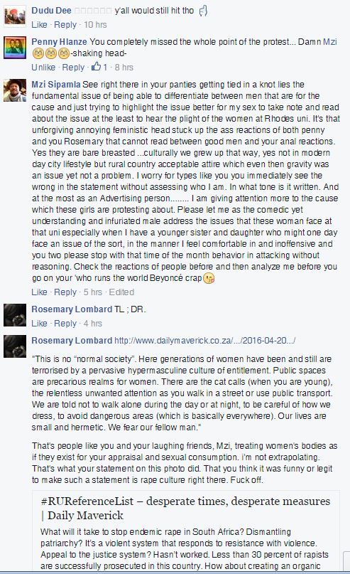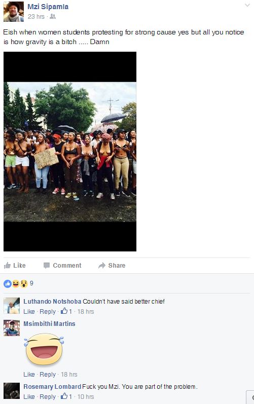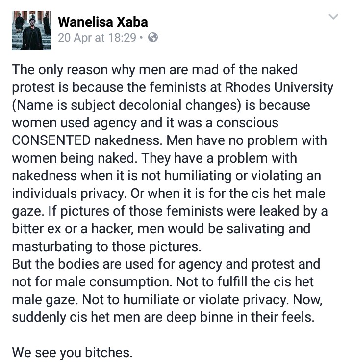 “In South Africa we have no business criticizing the young with homilies about propriety and dignity, decency and politesse. There can be no equality for young women in higher education if the spaces they are supposed to study in are organized around enabling their violation by omission, silence and inaction.