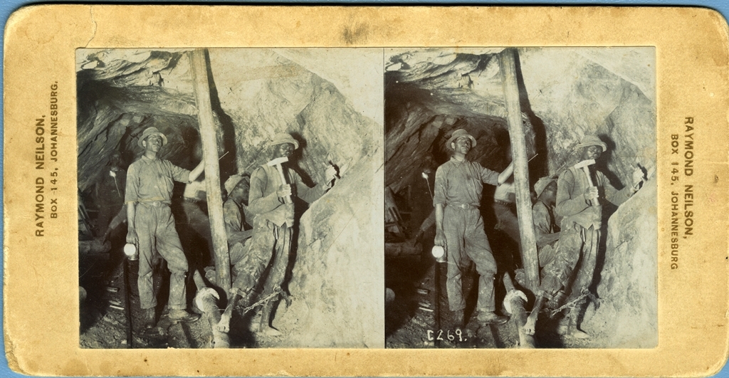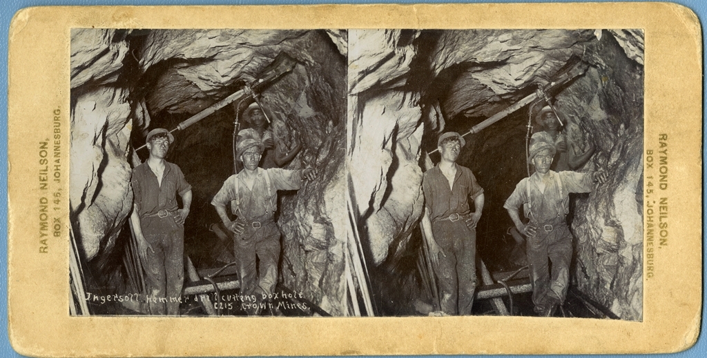 Each thick, oblong card with its rounded, scuffed edges discoloured by age has two seemingly identical images on it, side by side, and is embossed with the name of what I guess must have been the photographer or printing studio’s name in gold down the margin: “RAYMOND NEILSON, BOX 145, JOHANNESBURG”. The images depict miners underground. Some are very faded, to the extent that the figures in them appear featureless and ghostly. There is virtually no annotation on most of the photos. On just a few of them, spidery white handwriting on the photo itself, as if scratched into the negative before it was printed, announces the name of the machinery or activity in the picture and the name of the mine: “Crown Mines”.