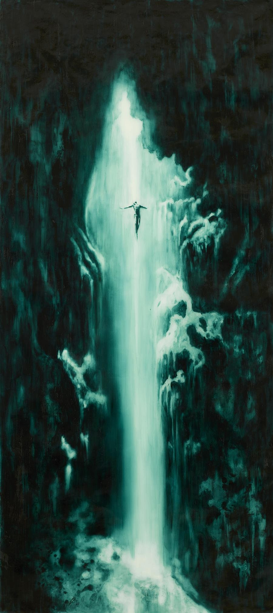 I also notice that the trick of parallax (and concurrently, the evocativeness) works most pronouncedly on the figures in the foreground, probably due to the camera angle and vanishing points of the perspective. Behind the two white youngsters, almost fading into the darkness, is a black man, holding up a drill over all of their heads that seems to penetrate the tunnel of rock in which they are suspended.
