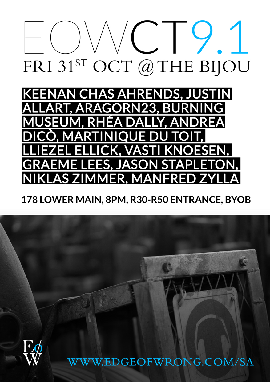 I’m part of the South African curatorial/organising team for this series of collaborative multi-medium performances. If you’re in Cape Town, check EOW 9.1 out tomorrow night.