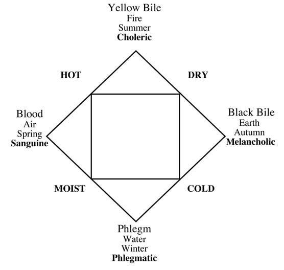 Phlegm, blood, yellow bile and black bile were believed to be the four governing elements, and each was ascribed to particular seasons, elements and temperaments. This can be expressed via a tetrad, or four-cornered diagram.