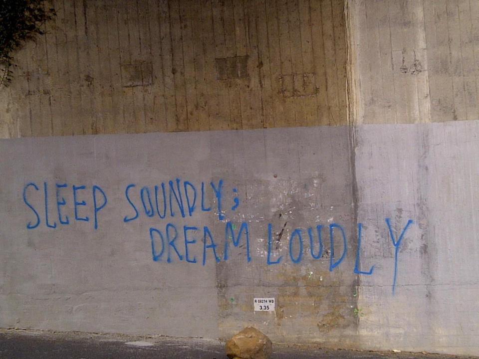 sleep soundly; dream loudly Posted on September 13, 2012 by cherry bomb Graffiti under the flyover, Roeland Street, Cape TownMarch 2012. Photo: Rosemary Lombard